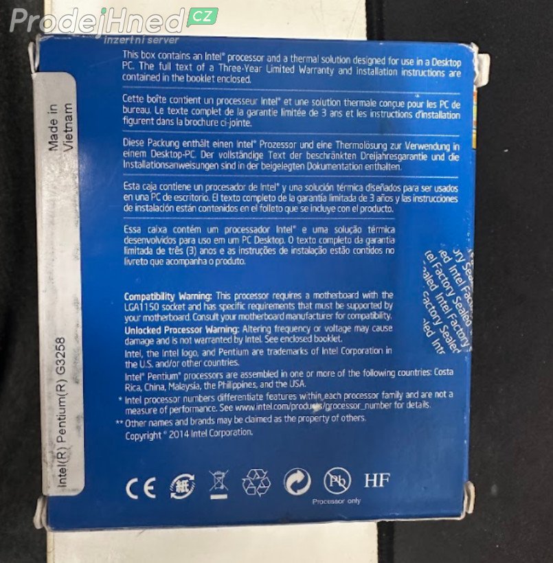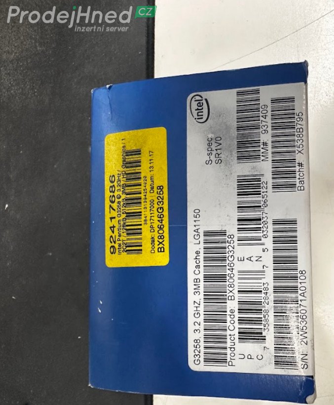 Intel Pentium G3258 (LGA1150) – nový, zapečetěný Prodám procesor Intel Pentium G3258 určený pro socket LGA1150, dvoujádrový procesor s frekvencí 3,2 GHz, 3 MB cache, TDP 53 W, vhodný pro běžné kancelářské použití, procesor je nový a zapečetěný v originálním balení, více inzerátů najdete v mém profilu.